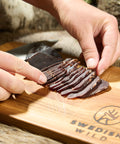 Torkat, lättrökt renkött – tillagat på äkta samiskt vis. Upptäck smaken av torkat renkött tillagat på traditionellt samiskt sätt – ett hantverk från Norrland som ger dig ett smakrikt och proteinrikt mellanmål med lätt rökiga toner. Vårt lättrökta renkött passar utmärkt att skiva i små bitar och njuta av som snacks, till en kall öl eller framför lägerelden i goda vänners sällskap.